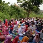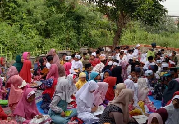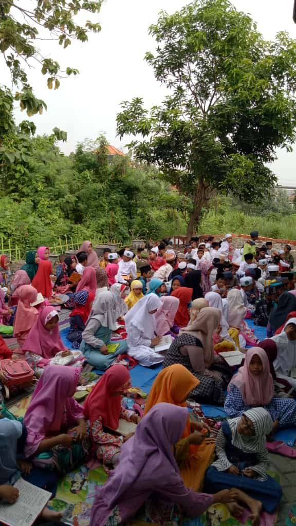 Antusiasme siswa MI Tarbiyatul Akhlaq mengikuti peringatan Maulid Nabi Muhammad SAW sangat membanggakan walaupun di alam terbuka.